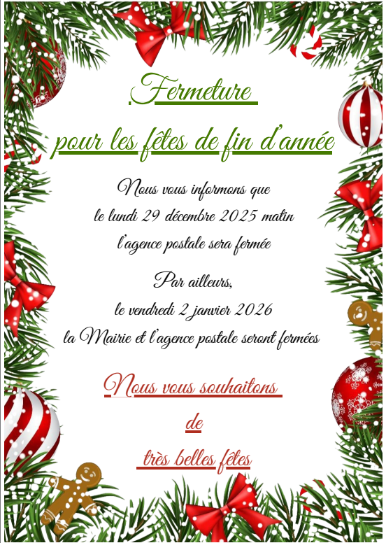 • Fermeture durant les fêtes de la Mairie et de l’Agence Postale communale 24 décembre 2025